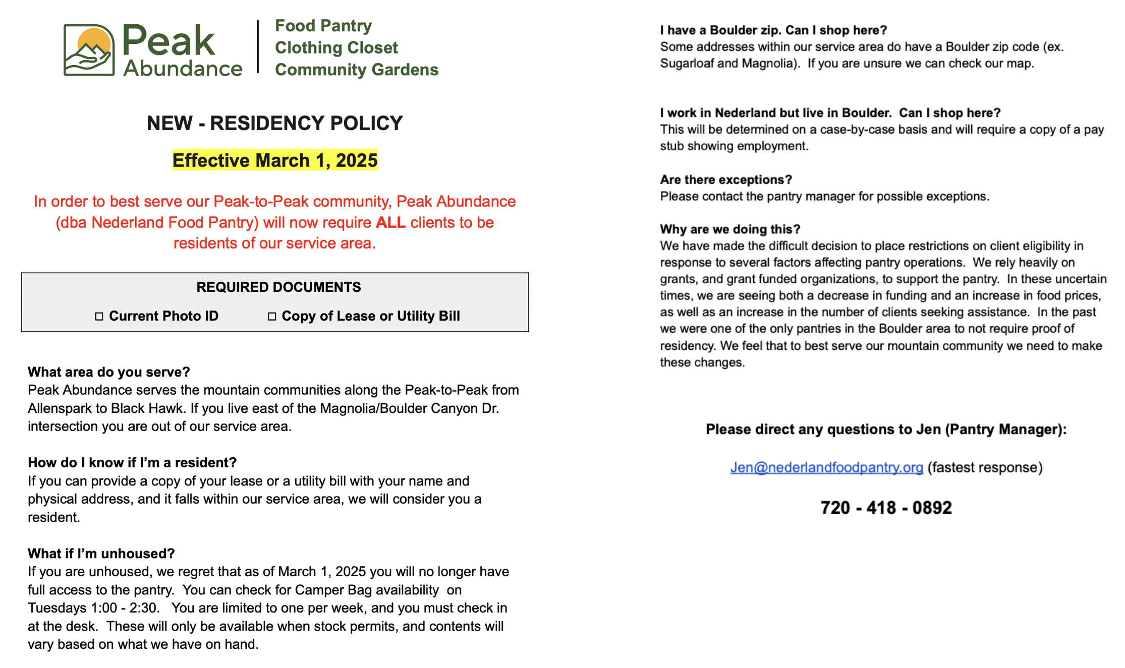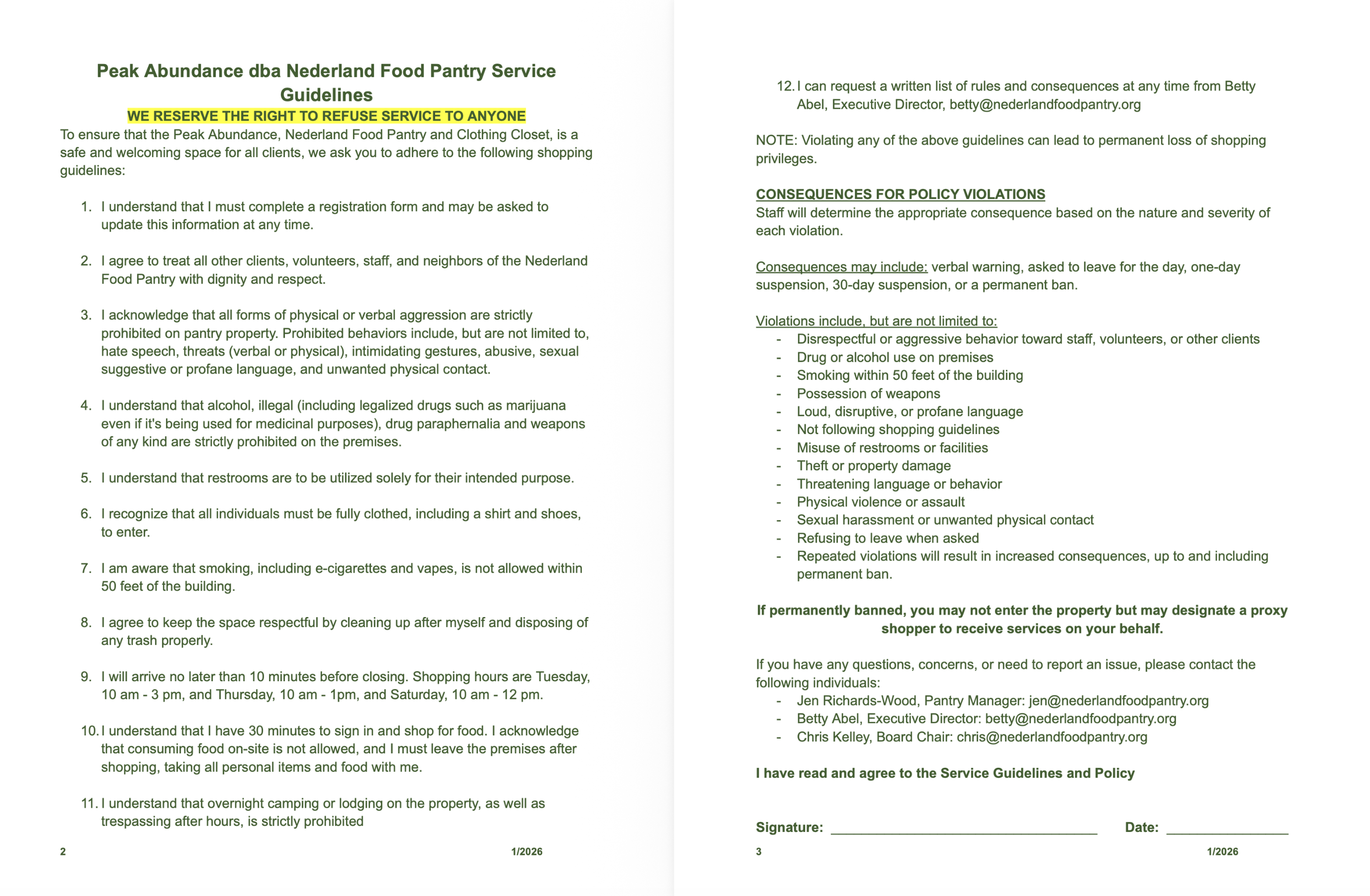 Peak Abundance dba Nederland Food Pantry is committed to providing you with a clear understanding of our policies. Our guidelines are here to help create a welcoming and respectful environment for everyone. Here you'll find helpful information about our service and resident policies. We encourage you to take a moment to review these, as they contain important details that will help you make the most of your time with us.